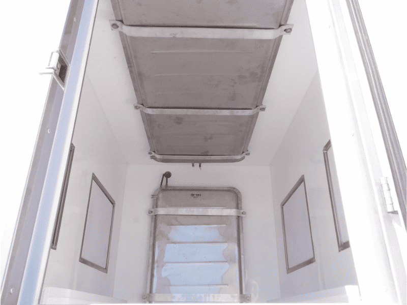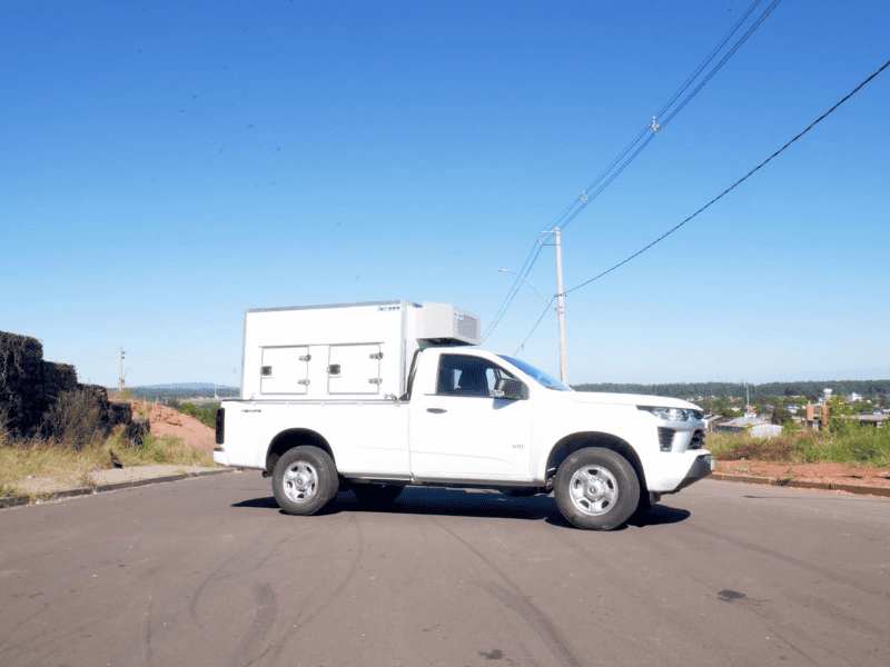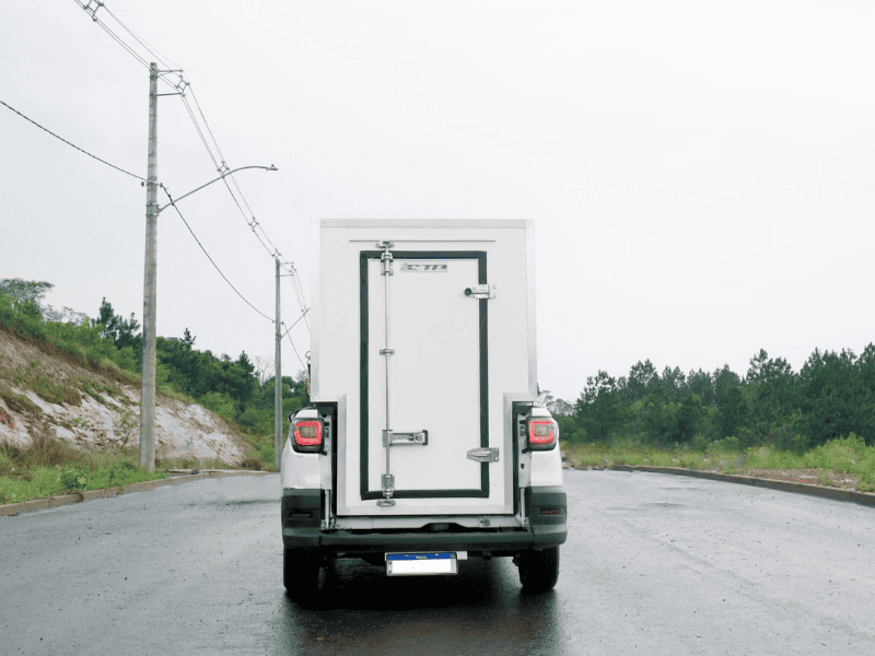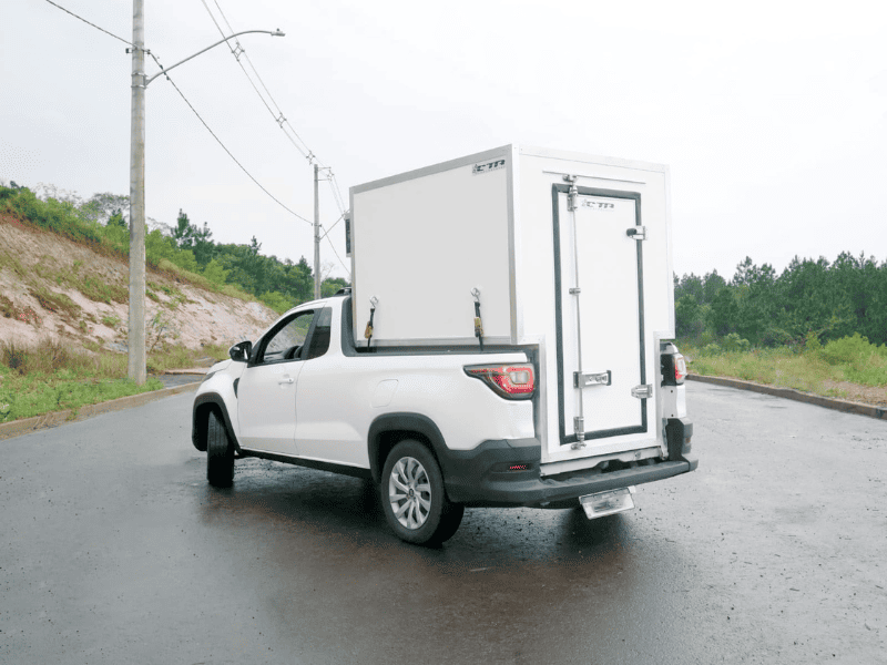 - Baú fabricado em fibra plástica com isolamento em XPS, densidade de 45kg/m³ com espessura de 80mm, desenvolvida para resfriados e congelados.